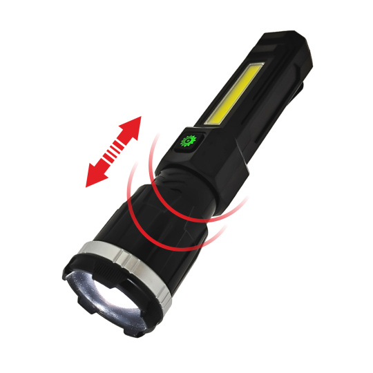 Svítilna nabízí proměnnou ohniskovou vzdálenost a tři režimy svícení – 100%, 50% a blikání – takže si můžete přizpůsobit intenzitu světla podle aktuální situace. Hlavní COB LED dioda se svítivostí 200lm a doplňkový boční LED panel se 100lm zajišťují dostatečné osvětlení pro široké využití.
