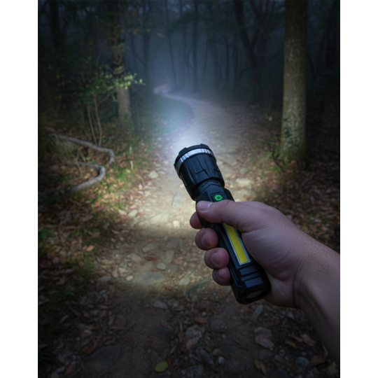 Svítilna nabízí proměnnou ohniskovou vzdálenost a tři režimy svícení – 100%, 50% a blikání – takže si můžete přizpůsobit intenzitu světla podle aktuální situace. Hlavní COB LED dioda se svítivostí 200lm a doplňkový boční LED panel se 100lm zajišťují dostatečné osvětlení pro široké využití.