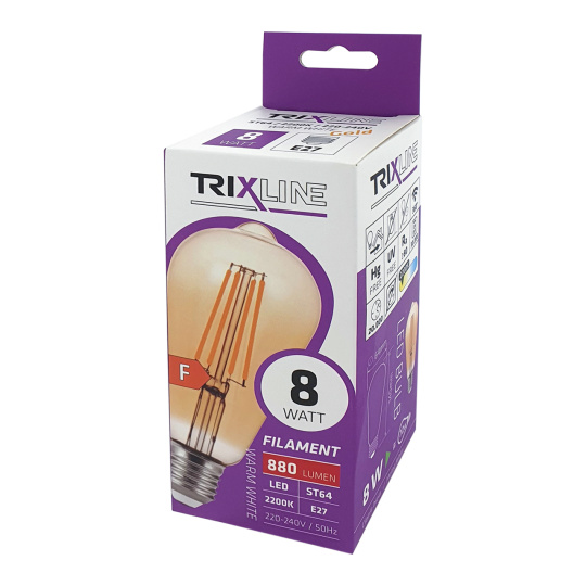 DEKORAČNÍ LED RETRO ŽÁROVKA TRIXLINE s paticí E27 a příkonem 8W ≅ 72W. Dekorativní žárovka imituje první Edisonovy žárovky. Díky LED technologii je i mimořádně úsporná. Používají se zejména do retro svítidel, nebo lze použít také jako volně visící na samostatném závěsu. Pak tvoří velice dekorativní prvek osvětlení nejčastěji se používá v hotelech, restauracích apod.