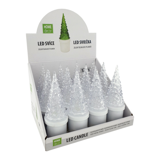 Bílá LED svíčka křišťálově průhledný stromeček HD-134 HOME DECOR se zelným blikajícím plamínkem. Vhodná alternativa klasické svíčky. Snadné a bezpečné použití bez rizika požáru. Zapnutí pootočením víka. Napájeno pomoci 2x C R14 UM2 baterií (jsou součástí).