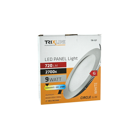 Kruhový vestavný LED panel Trixline TR-127 o výkonu 9W se světelným tokem 720lm a teplou bílou barvou světla 2700K. Teple bílá barva světla zútulňuje prostor, vyvolává pocit pohody a tepla. Je vhodná do místnosti, kde chceme relaxovat a odpočívat. Panel je vyroben z kvalitního hliníku. Díky použité LED technologii ušetříte až 85% energie. Je určen do interiéru k zapuštění do sádrokartónu s montážním otvorem ø13cm. Vnější rozměr světla je ø14,5x1,45cm.
