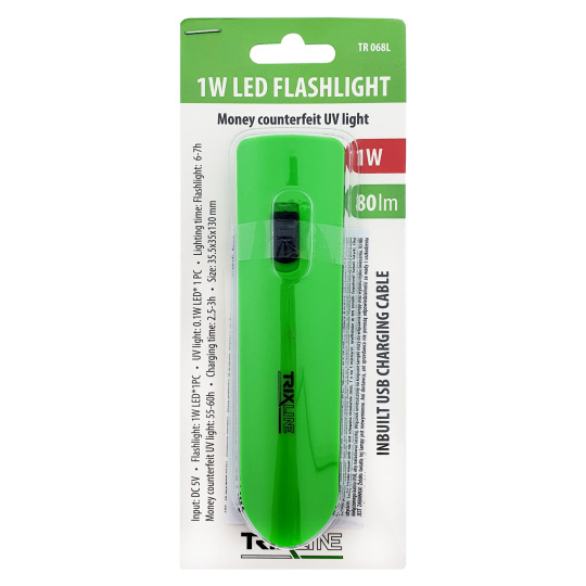 LED svítilna s UV testrem bankovek TR 068L Trixline - zelená. Výhodou svítilny je integrovaný USB nabíjecí kabel. Posuvným vypínačem na těle svítilny volíme režim předního LED 1W svícení nebo UV 0,1W LED detektor, který dokáže ověřit ochranné prvky bankovek - vodoznak, okénkový proužek s mikrotextem, barevná vlákna. Před prvním použitím svítilnu plně nabijte. Nabíjejte i v případě, že není pravidelně používána (min. 1x za 3 měsíce), prodloužíte tím životnost akumulátoru svítilny.