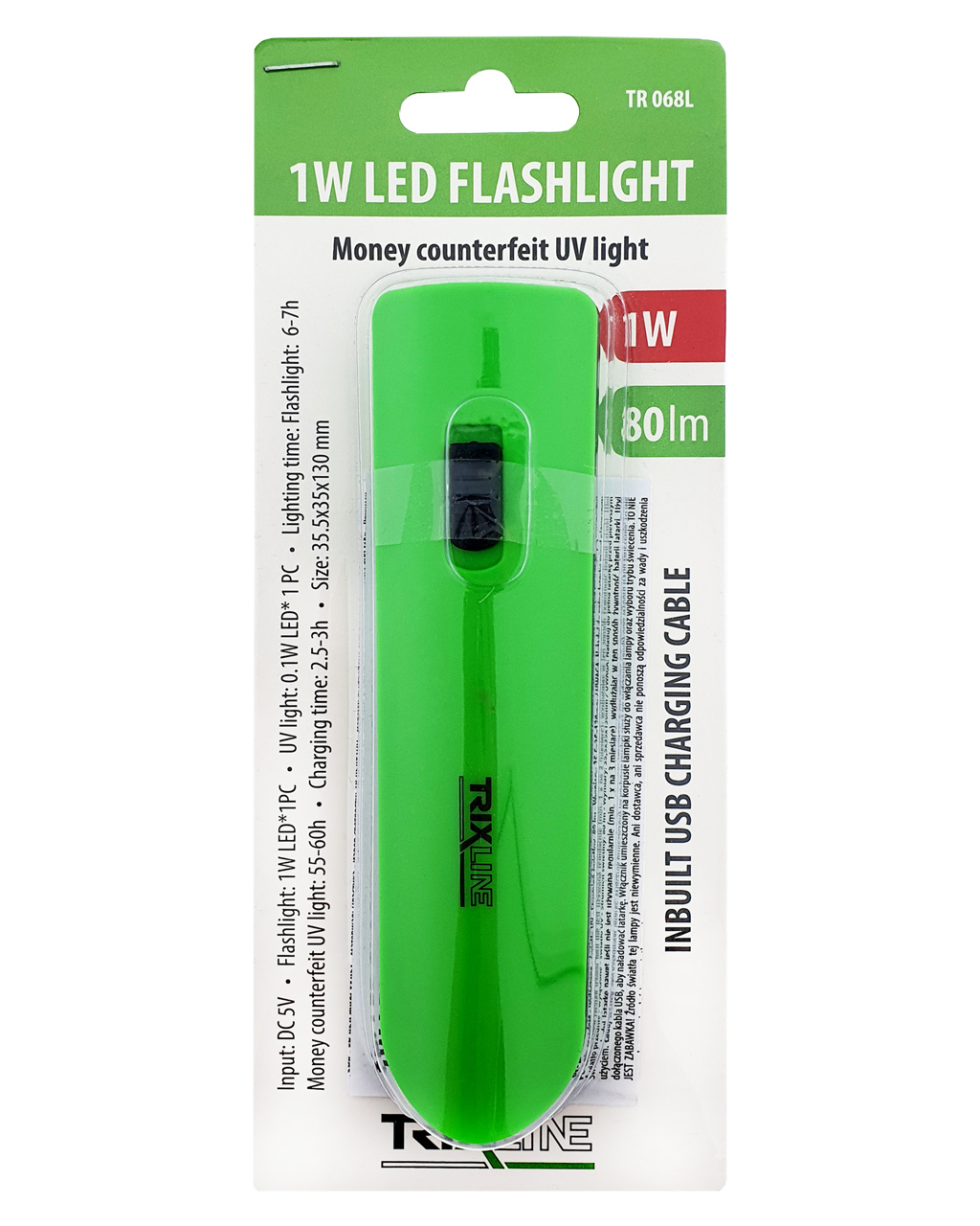 LED svítilna s UV testrem bankovek TR 068L Trixline - zelená. Výhodou svítilny je integrovaný USB nabíjecí kabel. Posuvným vypínačem na těle svítilny volíme režim předního LED 1W svícení nebo UV 0,1W LED detektor, který dokáže ověřit ochranné prvky bankovek - vodoznak, okénkový proužek s mikrotextem, barevná vlákna. Před prvním použitím svítilnu plně nabijte. Nabíjejte i v případě, že není pravidelně používána (min. 1x za 3 měsíce), prodloužíte tím životnost akumulátoru svítilny.