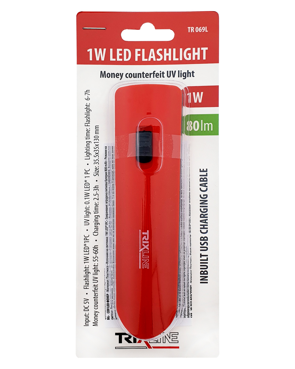 LED svítilna s UV testrem bankovek TR 069L Trixline - červené barvy. Výhodou svítilny je integrovaný USB nabíjecí kabel. Posuvným vypínačem na těle svítilny volíme režim předního LED 1W svícení nebo UV 0,1W LED detektor, který dokáže ověřit ochranné prvky bankovek - vodoznak, okénkový proužek s mikrotextem, barevná vlákna. Před prvním použitím svítilnu plně nabijte. Nabíjejte i v případě, že není pravidelně používána (min. 1x za 3 měsíce), prodloužíte tím životnost akumulátoru svítilny.