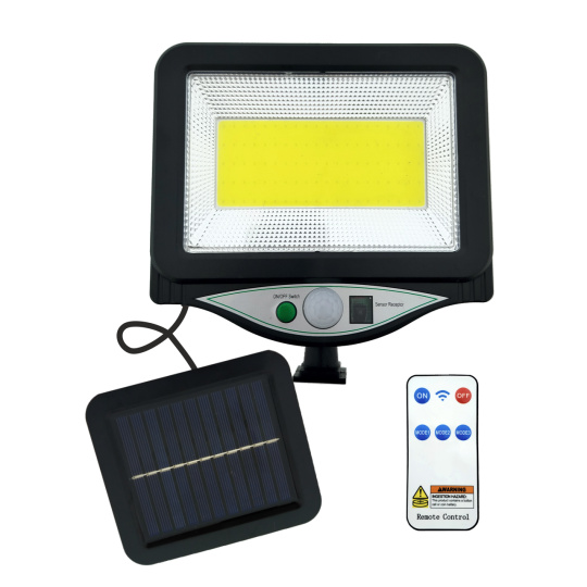 Obsah balení: 1 ks LED solární reflektor, 1 ks solární panel, 1 ks dálkový ovladač, 2 ks podložka pro připevnění, 8 šroubků, 8 hmoždinek