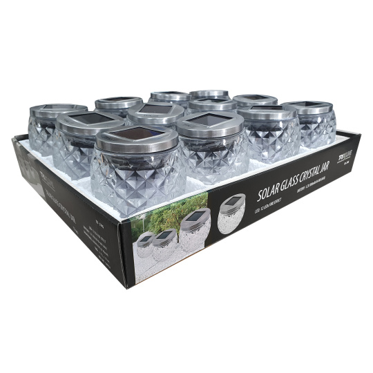 Dekorativní LED osvětlení je napájeno pomoci vestavěného solárního panelu na víku dózy. Víko je opatřeno těsnící gumou a tlačítkem on/off. Křišťálové tělo nádoby vyrobeno z vysoce odolného, kvalitně zpracovaného mozaikového skla s hmotností 600g. Ideální na zahradu, terasu, balkón, stůl, skalku apod.