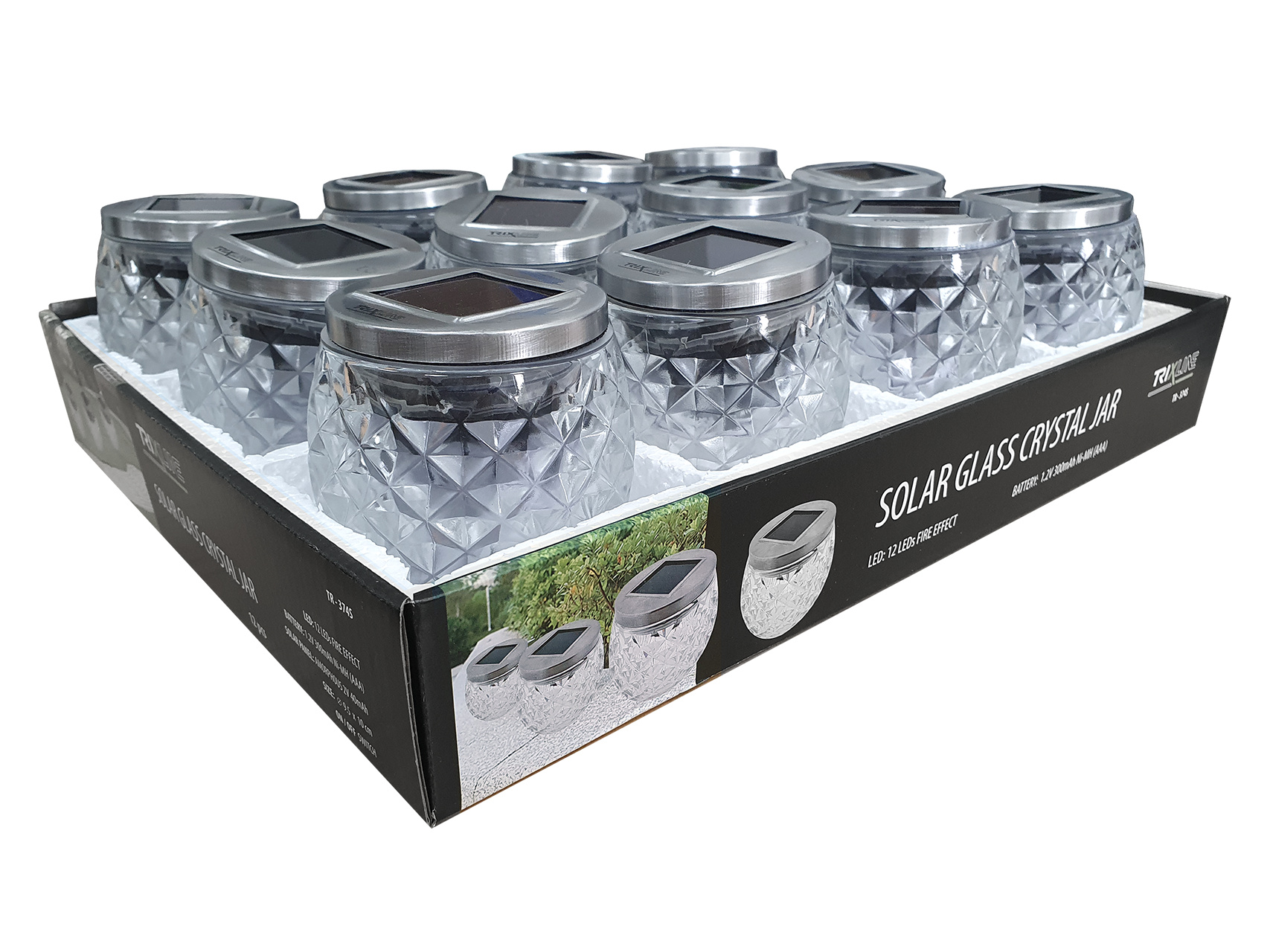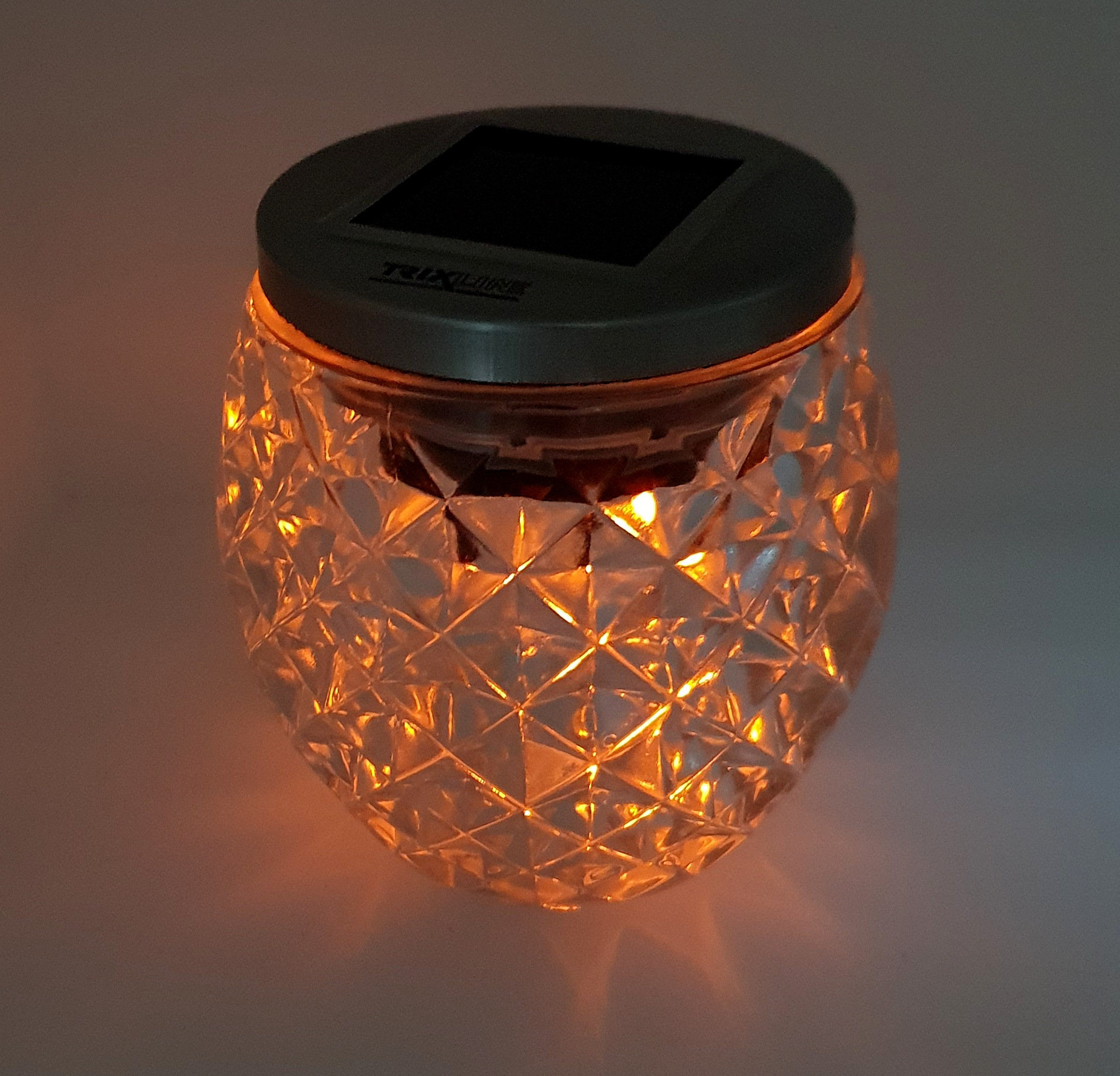 Dekorativní LED osvětlení je napájeno pomoci vestavěného solárního panelu na víku dózy. Víko je opatřeno těsnící gumou a tlačítkem on/off. Křišťálové tělo nádoby vyrobeno z vysoce odolného, kvalitně zpracovaného mozaikového skla s hmotností 600g. Ideální na zahradu, terasu, balkón, stůl, skalku apod.