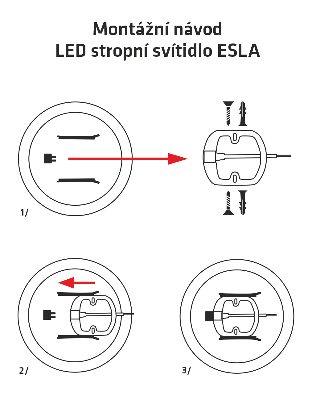 - Připevněte držák světla k pevnému podkladu např. na strop zeď apod. (součástí balení 2 šroubky, 2 hmoždinky).