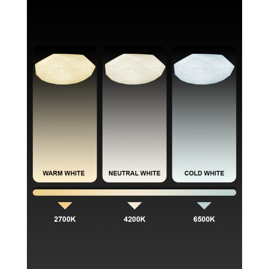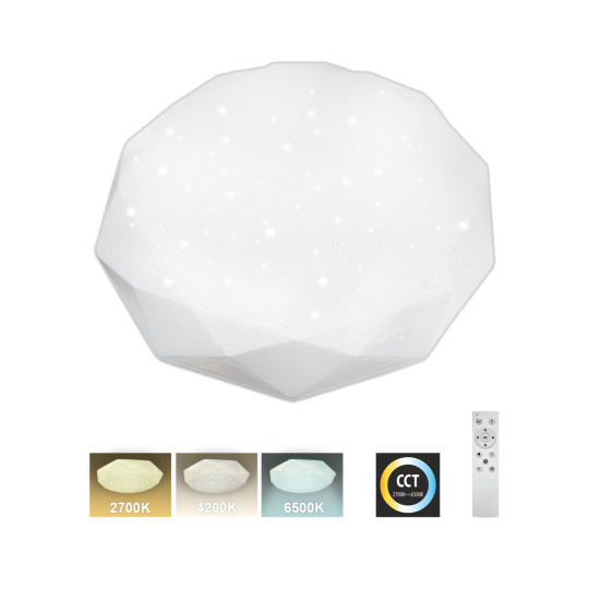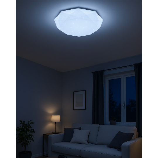 LED stropní svítidlo TR-600C - INDUS Trixline v bílé barvě se třpytivým efektem je určeno do vnitřních prostor jako jsou obývací pokoje, ložnice, haly, kanceláře, chodby a podobná místa. Pomocí přiloženého ovladače můžete přepínat mezi třemi světelnými teplotami v rozmezí 2700K až 6500K, které lze stmívat dle potřeby pro navození příjemné atmosféry. Při maximálním ztlumení klesá spotřeba až na pouhých 8W z původních 60W, což zaručuje úsporu energie. Další možností na dálkovém ovladači je i noční režim a funkce 30 vteřin po jejichž uplynutí se LED svítidlo samo vypne. Svítidlo si po vypnutí pamatuje poslední nastavený režim, což zajišťuje pohodlné a intuitivní používání.