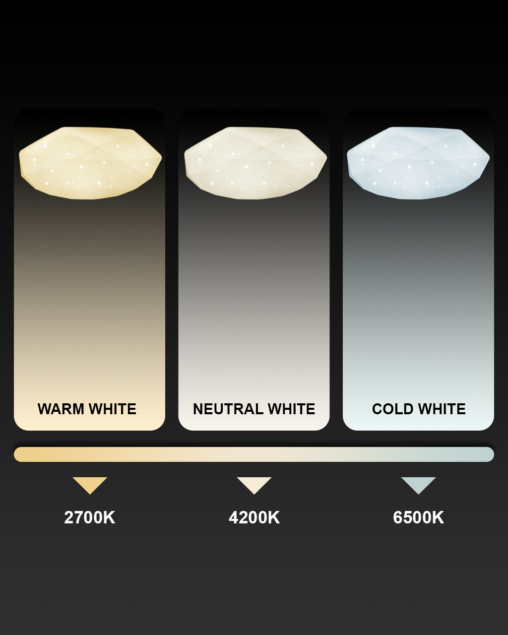 LED stropní svítidlo TR-600C - INDUS Trixline v bílé barvě se třpytivým efektem je určeno do vnitřních prostor jako jsou obývací pokoje, ložnice, haly, kanceláře, chodby a podobná místa. Pomocí přiloženého ovladače můžete přepínat mezi třemi světelnými teplotami v rozmezí 2700K až 6500K, které lze stmívat dle potřeby pro navození příjemné atmosféry. Při maximálním ztlumení klesá spotřeba až na pouhých 8W z původních 60W, což zaručuje úsporu energie. Další možností na dálkovém ovladači je i noční režim a funkce 30 vteřin po jejichž uplynutí se LED svítidlo samo vypne. Svítidlo si po vypnutí pamatuje poslední nastavený režim, což zajišťuje pohodlné a intuitivní používání.