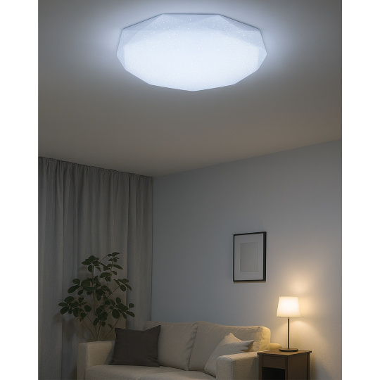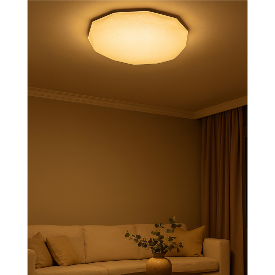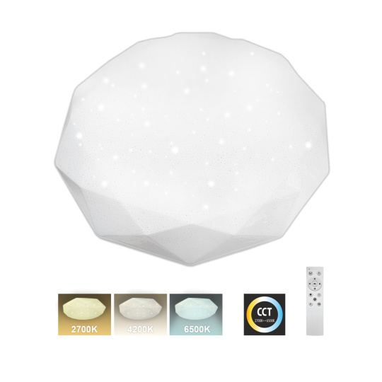 LED stropní svítidlo TR-601C - INDUS Trixline v bílé barvě se třpytivým efektem je určeno do vnitřních prostor jako jsou obývací pokoje, ložnice, haly, kanceláře, chodby a podobná místa. Pomocí přiloženého ovladače můžete přepínat mezi třemi světelnými teplotami v rozmezí 2700K až 6500K, které lze stmívat dle potřeby pro navození příjemné atmosféry. Při maximálním ztlumení klesá spotřeba až na pouhých 14W z původních 80W, což zaručuje úsporu energie. Další možností na dálkovém ovladači je i noční režim a funkce 30 vteřin po jejichž uplynutí se LED svítidlo samo vypne. Svítidlo si po vypnutí pamatuje poslední nastavený režim, což zajišťuje pohodlné a intuitivní používání.