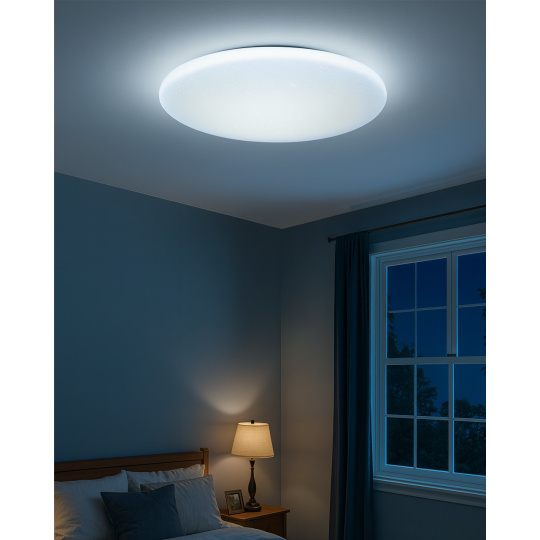 LED stropní svítidlo TR-603C - IPOLY Trixline v bílé barvě se třpytivým efektem je určeno do vnitřních prostor jako jsou obývací pokoje, ložnice, haly, kanceláře, chodby a podobná místa. Pomocí přiloženého ovladače můžete přepínat mezi třemi světelnými teplotami v rozmezí 2700K až 6500K, které lze stmívat dle potřeby pro navození příjemné atmosféry. Při maximálním ztlumení klesá spotřeba až na pouhých 14W z původních 80W, což zaručuje úsporu energie. Další možností na dálkovém ovladači je i noční režim a funkce 30 vteřin po jejichž uplynutí se LED svítidlo samo vypne. Svítidlo si po vypnutí pamatuje poslední nastavený režim, což zajišťuje pohodlné a intuitivní používání.