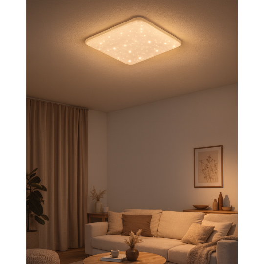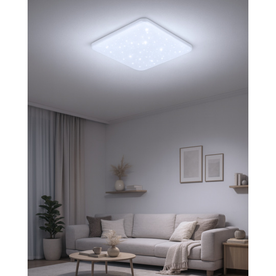 LED stropní svítidlo TR-605S - FLORA Trixline v bílé barvě se třpytivým efektem je určeno do vnitřních prostor jako jsou obývací pokoje, ložnice, haly, kanceláře, chodby a podobná místa. Pomocí přiloženého ovladače můžete přepínat mezi třemi světelnými teplotami v rozmezí 2700K až 6500K, které lze stmívat dle potřeby pro navození příjemné atmosféry. Při maximálním ztlumení klesá spotřeba až na pouhých 8W z původních 60W, což zaručuje úsporu energie. Další možností na dálkovém ovladači je i noční režim a funkce 30 vteřin po jejichž uplynutí se LED svítidlo samo vypne. Svítidlo si po vypnutí pamatuje poslední nastavený režim, což zajišťuje pohodlné a intuitivní používání.