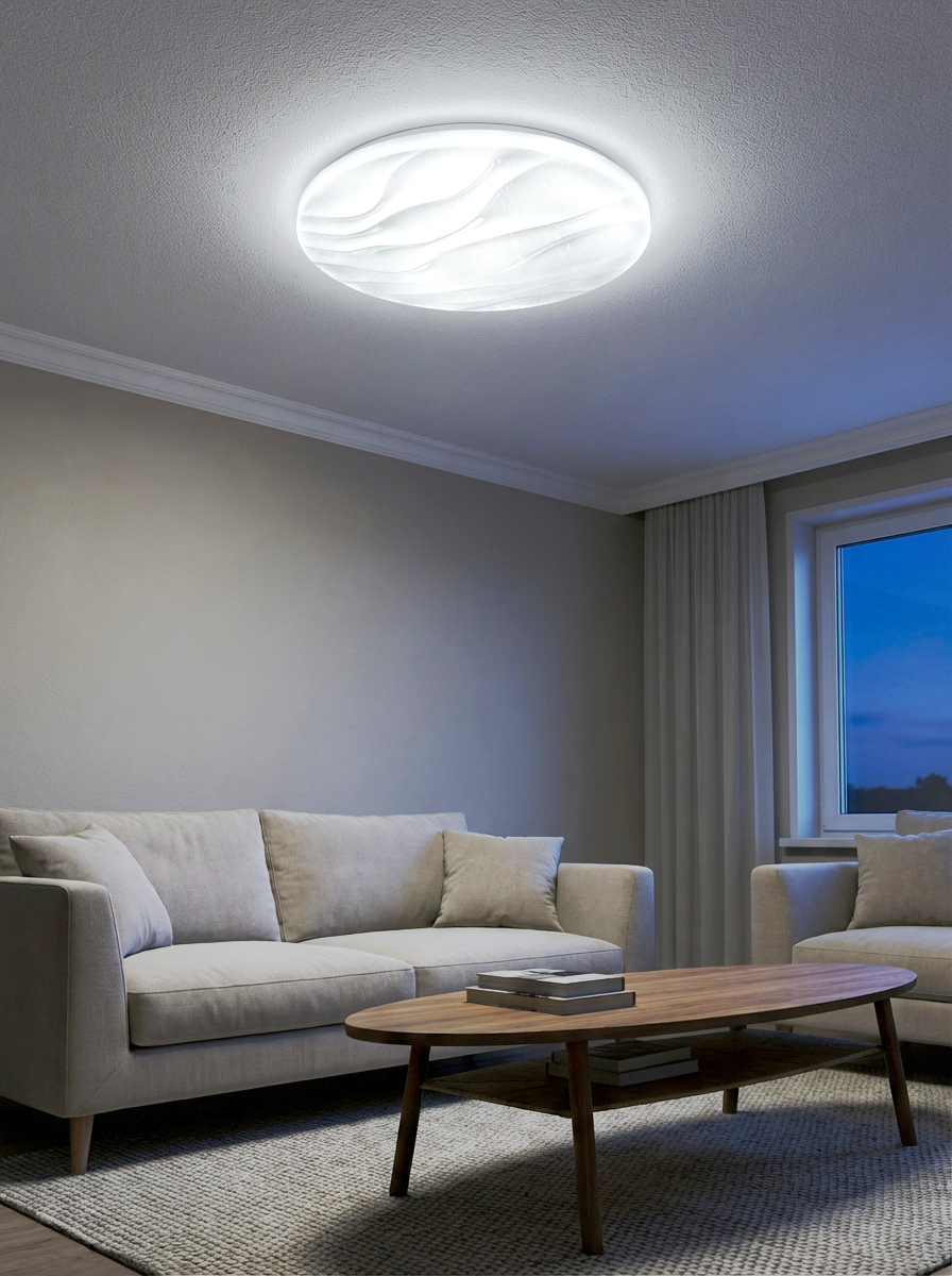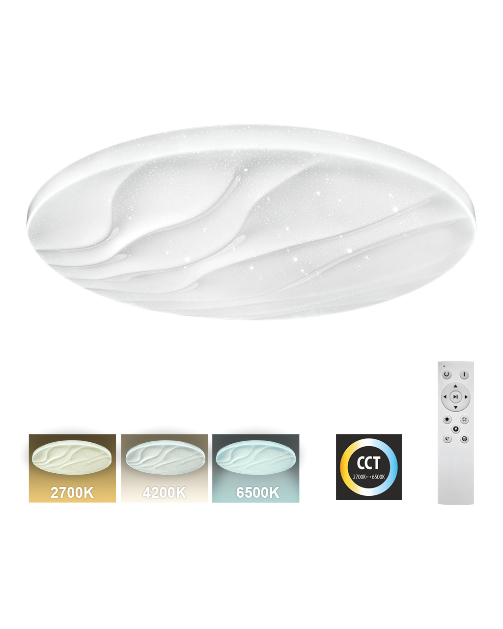 LED stropní svítidlo TR-607C - LIKA Trixline v bílé barvě se třpytivým efektem je určeno do vnitřních prostor jako jsou obývací pokoje, ložnice, haly, kanceláře, chodby a podobná místa. Pomocí přiloženého ovladače můžete přepínat mezi třemi světelnými teplotami v rozmezí 2700K až 6500K, které lze stmívat dle potřeby pro navození příjemné atmosféry. Při maximálním ztlumení klesá spotřeba až na pouhých 8W z původních 60W, což zaručuje úsporu energie. Další možností na dálkovém ovladači je i noční režim a funkce 30 vteřin po jejichž uplynutí se LED svítidlo samo vypne. Svítidlo si po vypnutí pamatuje poslední nastavený režim, což zajišťuje pohodlné a intuitivní používání.