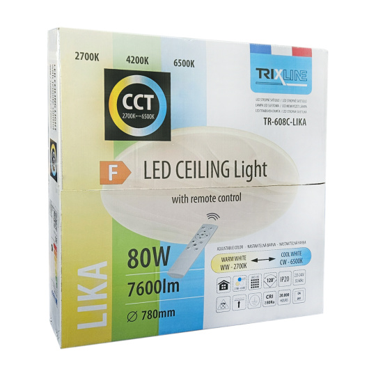 LED stropní svítidlo TR-608C - LIKA Trixline v bílé barvě se třpytivým efektem je určeno do vnitřních prostor jako jsou obývací pokoje, ložnice, haly, kanceláře, chodby a podobná místa. Pomocí přiloženého ovladače můžete přepínat mezi třemi světelnými teplotami v rozmezí 2700K až 6500K, které lze stmívat dle potřeby pro navození příjemné atmosféry. Při maximálním ztlumení klesá spotřeba až na pouhých 14W z původních 80W, což zaručuje úsporu energie. Další možností na dálkovém ovladači je i noční režim a funkce 30 vteřin po jejichž uplynutí se LED svítidlo samo vypne. Svítidlo si po vypnutí pamatuje poslední nastavený režim, což zajišťuje pohodlné a intuitivní používání.