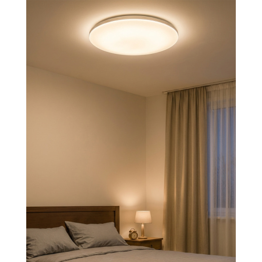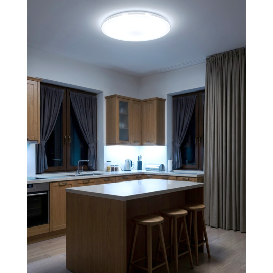 LED stropní svítidlo TR-612C - VENTA Trixline v bílé barvě se čtyřmi stříbrnými proužky po obvodu a třpytivým světelným efektem. Svítidlo má variabilní design, kdy můžete odejmout stříbrné proužky a ponechat pouze čistě bílé okraje. Je určeno do vnitřních prostor jako jsou obývací pokoje, ložnice, haly, kanceláře, chodby a podobná místa. Pomocí přiloženého ovladače můžete přepínat mezi třemi světelnými teplotami v rozmezí 2700K až 6500K, které lze stmívat dle potřeby pro navození příjemné atmosféry. Při maximálním ztlumení klesá spotřeba až na pouhých 8W z původních 60W, což zaručuje úsporu energie. Další možností na dálkovém ovladači je i noční režim a funkce 30 vteřin po jejichž uplynutí se LED svítidlo samo vypne. Svítidlo si po vypnutí pamatuje poslední nastavený režim, což zajišťuje pohodlné a intuitivní používání.