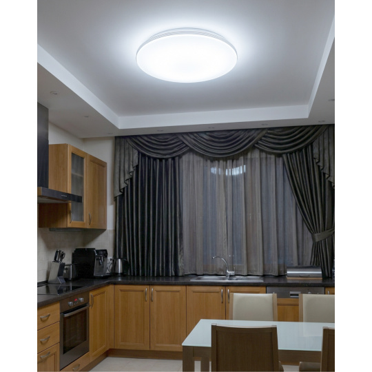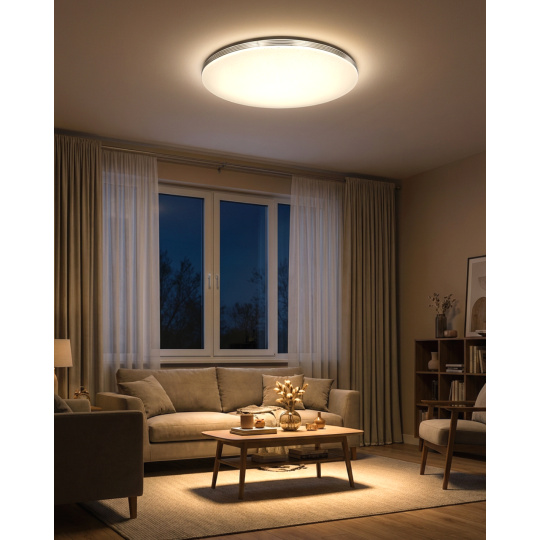LED stropní svítidlo TR-613C - LIKA Trixline v bílé barvě se čtyřmi stříbrnými proužky po obvodu a třpytivým světelným efektem. Svítidlo má variabilní design, kdy můžete odejmout stříbrné proužky a ponechat pouze čistě bílé okraje. Je určeno do vnitřních prostor jako jsou obývací pokoje, ložnice, haly, kanceláře, chodby a podobná místa. Pomocí přiloženého ovladače můžete přepínat mezi třemi světelnými teplotami v rozmezí 2700K až 6500K, které lze stmívat dle potřeby pro navození příjemné atmosféry. Při maximálním ztlumení klesá spotřeba až na pouhých 14W z původních 80W, což zaručuje úsporu energie. Další možností na dálkovém ovladači je i noční režim a funkce 30 vteřin po jejichž uplynutí se LED svítidlo samo vypne. Svítidlo si po vypnutí pamatuje poslední nastavený režim, což zajišťuje pohodlné a intuitivní používání.