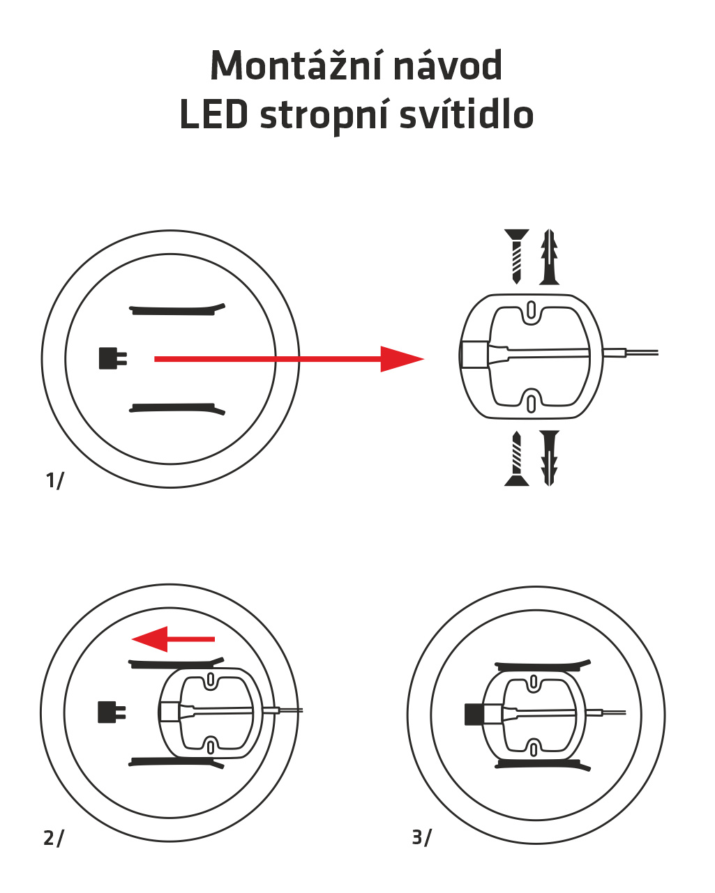 - Připevněte držák světla k pevnému podkladu např. na strop zeď apod. (součástí balení 2 šroubky, 2 hmoždinky).