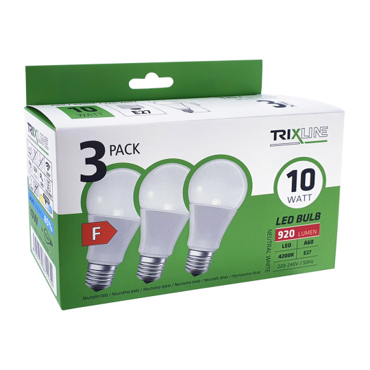 LED ŽÁROVKY TRIXLINE ve výhodném balení po 3 kusech. Úsporná LED žárovka s paticí E27 je šetrná k životnímu prostředí, neobsahuje žádnou rtuť ani olovo. Na rozdíl od vláknových žárovek zvládá i extrémně nízké a vysoké teploty. Její životnost dosahuje až 30 000 hodin. Díky LED žárovce 10W ušetříte 85% energie, výborně poslouží jako náhrada za klasickou 73W žárovku. LED žárovka se po zapnutí okamžitě rozsvítí bez jakékoliv prodlevy a vyzařuje příjemné neutrální bílé světlo 4200K. Žárovku můžete použít v kuchyni nebo koupelně, barva světla je ideální pro místa s nedostatkem denního světla.