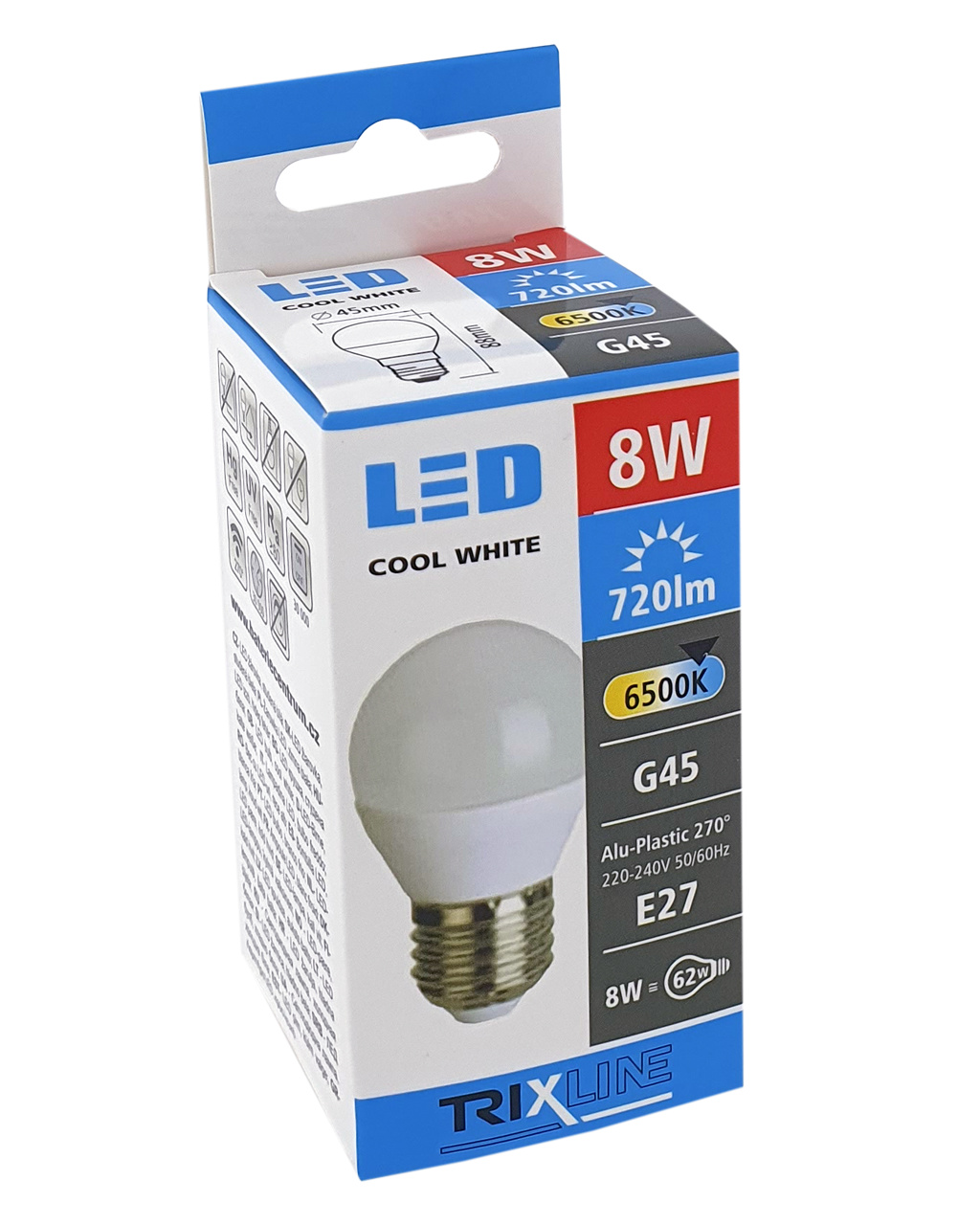 LED ŽÁROVKA TRIXLINE je úsporná LED žárovka s paticí E27, šetrná k životnímu prostředí, neobsahuje totiž žádnou rtuť ani olovo, navíc se dobře osvědčuje i při extrémně nízkých i vysokých teplotách, kdy s vláknovými žárovkami bývají problémy. Její životnost dosahuje až 30 000 hodin. Díky svému výkonu 8W výborně poslouží jako náhrada za klasickou 62W žárovku. LED žárovka se po zapnutí okamžitě rozsvítí bez jakékoliv prodlevy a vyzařuje příjemné studené bílé světlo 6500K.