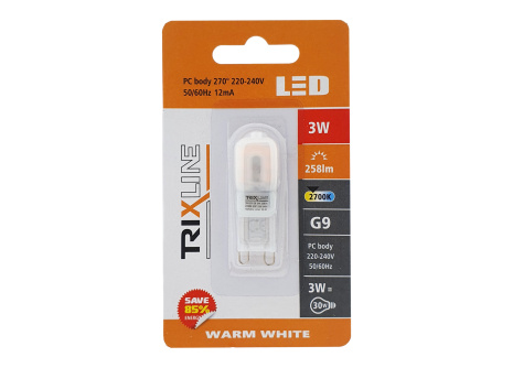 Kvalitní bodová LED žárovka s paticí G9 s výkonem 3W (náhrada za klasickou 30W žárovku). Poskytuje teplé bílé světlo. Použité moderní technologie a materiály zaručují dlouhou životnost s počtem až 30.000 hodin. Při zapnutí je okamžitě k dispozici plný světelný výkon žárovky bez jejího zahřívání.