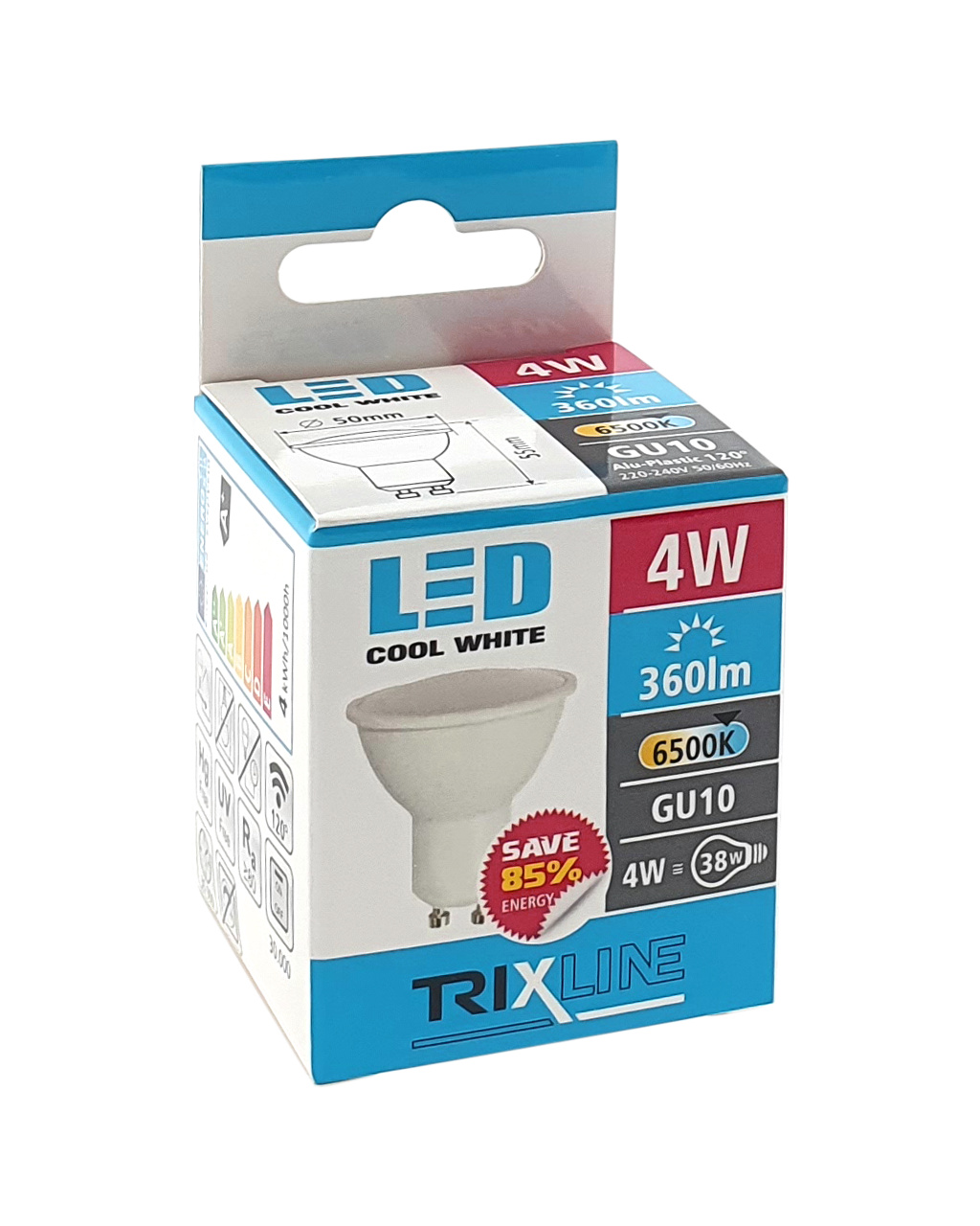 LED BODOVÁ ŽÁROVKA TRIXLINE je úsporná LED žárovka s paticí GU10, šetrná k životnímu prostředí, neobsahuje totiž žádnou rtuť ani olovo, navíc se dobře osvědčuje i při extrémně nízkých i vysokých teplotách, kdy s vláknovými žárovkami bývají problémy. Její životnost dosahuje až 30 000 hodin. Díky svému výkonu 4W výborně poslouží jako náhrada za klasickou 30W žárovku. LED žárovka se po zapnutí okamžitě rozsvítí bez jakékoliv prodlevy a vyzařuje příjemné studené bílé světlo 6500K.