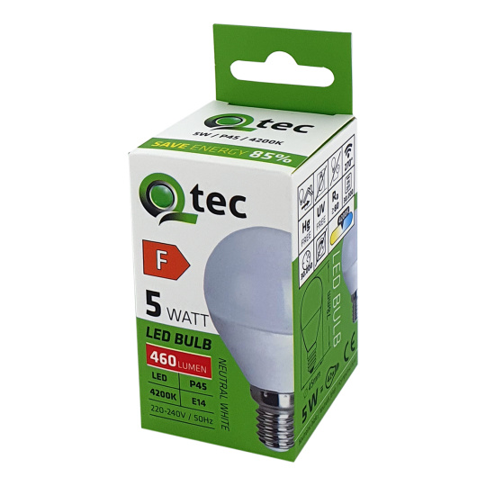LED ŽÁROVKA Qtec je úsporná LED žárovka s paticí E14, šetrná k životnímu prostředí, neobsahuje totiž žádnou rtuť ani olovo, navíc se dobře osvědčuje i při extrémně nízkých i vysokých teplotách, kdy s vláknovými žárovkami bývají problémy. Její životnost dosahuje až 30 000 hodin. LED žárovka se po zapnutí okamžitě rozsvítí bez jakékoliv prodlevy a vyzařuje příjemné neutrální bílé světlo 4200K.