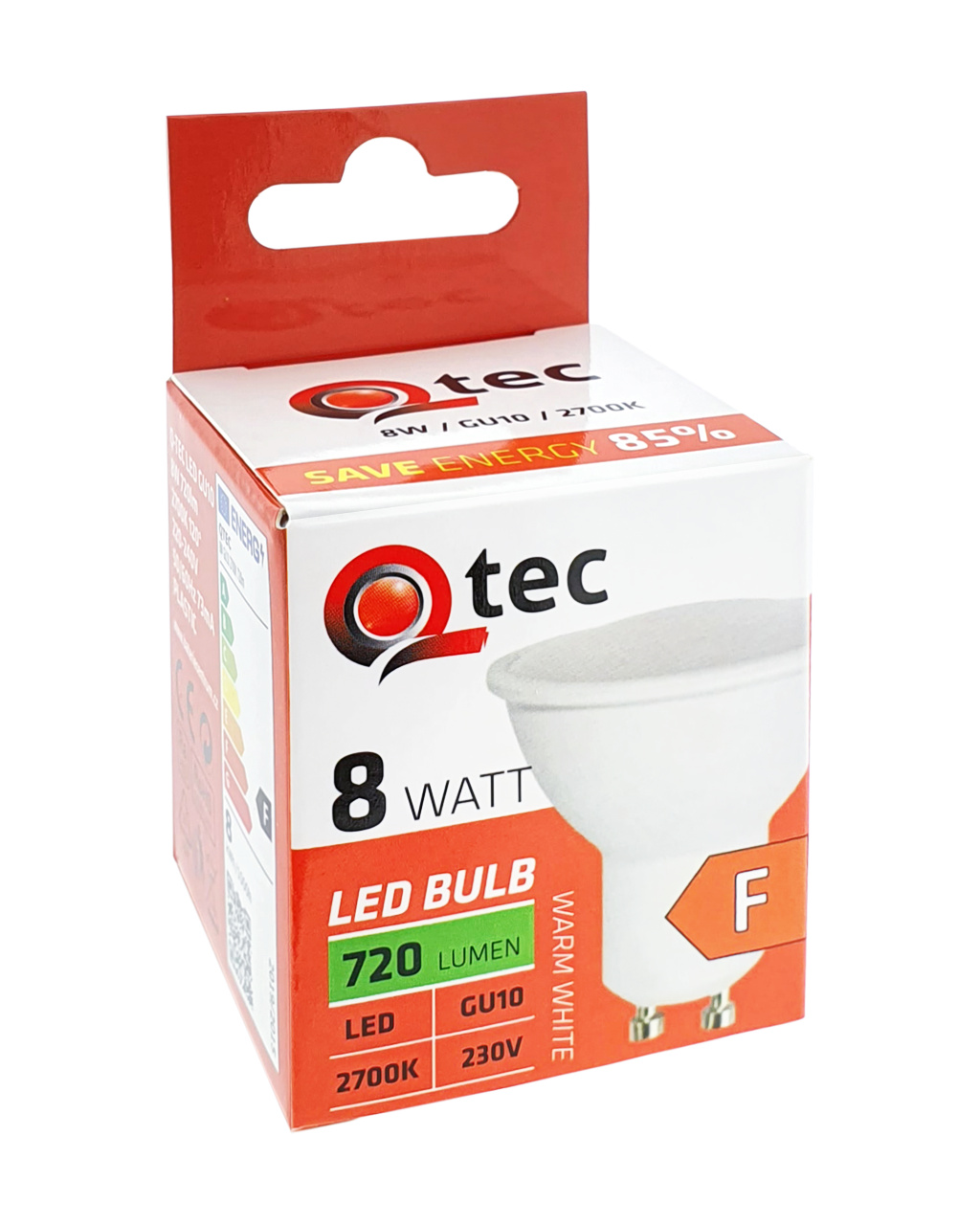 LED BODOVÁ ŽÁROVKA Q tec je úsporná LED žárovka s paticí GU10, šetrná k životnímu prostředí, neobsahuje totiž žádnou rtuť ani olovo, navíc se dobře osvědčuje i při extrémně nízkých i vysokých teplotách, kdy s vláknovými žárovkami bývají problémy. Její životnost dosahuje až 30 000 hodin. Díky svému výkonu 8W výborně poslouží jako náhrada za klasickou 63W žárovku. LED žárovka se po zapnutí okamžitě rozsvítí bez jakékoliv prodlevy a vyzařuje příjemné studené bílé světlo 2700K.