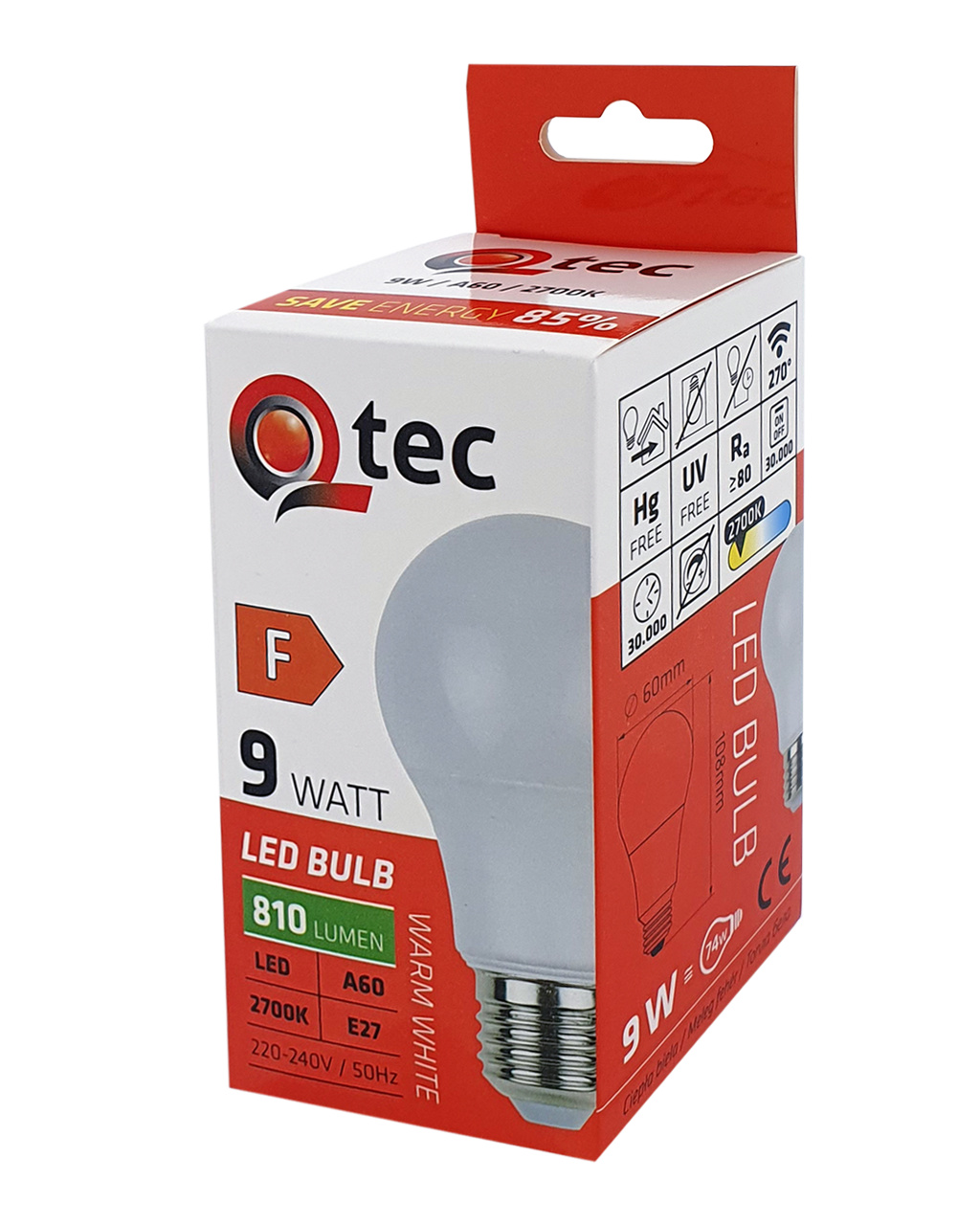 LED ŽÁROVKA Qtec je úsporná LED žárovka s paticí E27, šetrná k životnímu prostředí, neobsahuje totiž žádnou rtuť ani olovo, navíc se dobře osvědčuje i při extrémně nízkých i vysokých teplotách, kdy s vláknovými žárovkami bývají problémy. Její životnost dosahuje až 30 000 hodin. Díky svému výkonu 9W výborně poslouží jako náhrada za klasickou 74W žárovku. LED žárovka se po zapnutí okamžitě rozsvítí bez jakékoliv prodlevy a vyzařuje příjemné teplé bílé světlo 2700K.