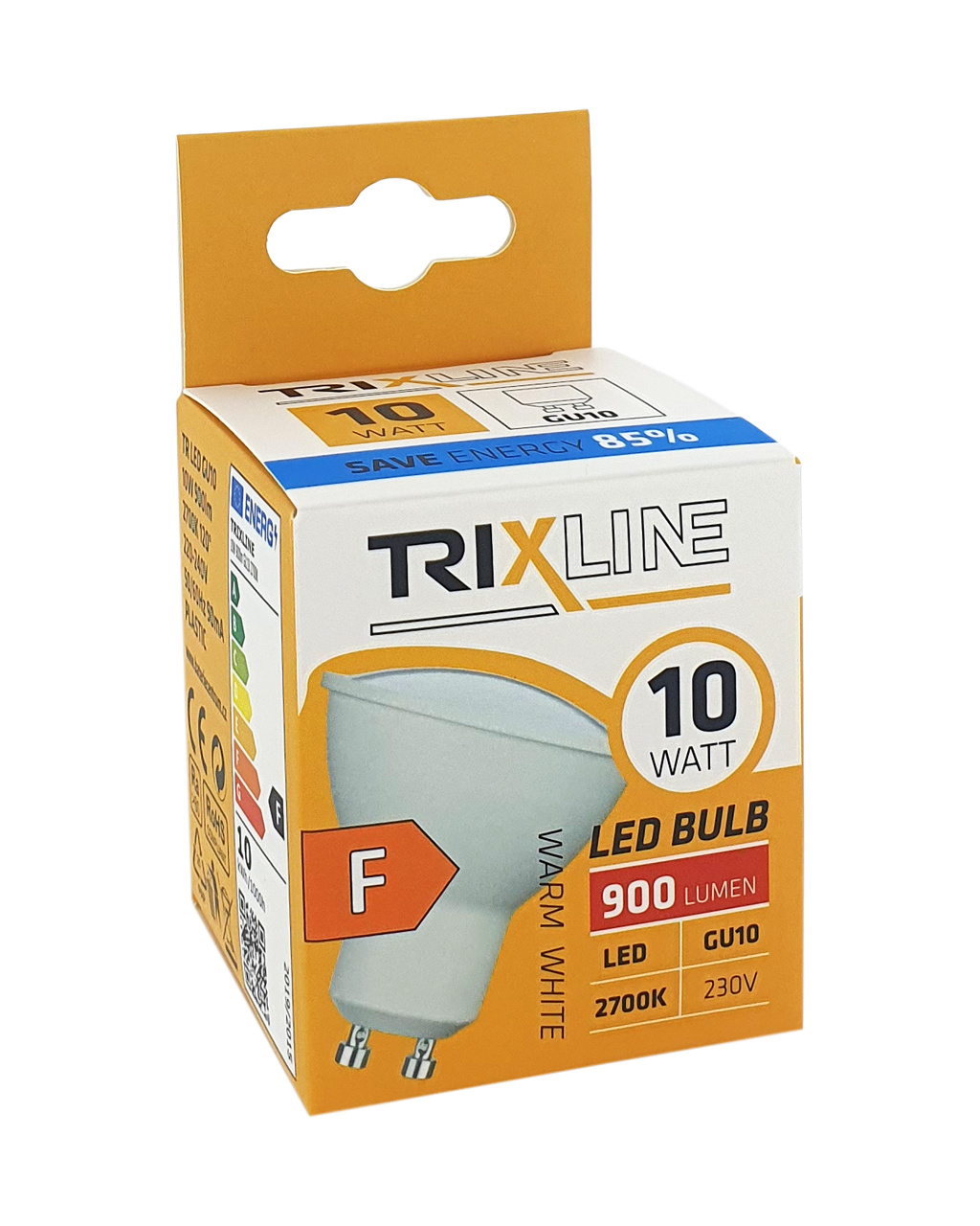 Úsporná LED žárovka Trixline s paticí GU10, šetrná k životnímu prostředí, neobsahuje žádnou rtuť ani olovo, navíc se dobře osvědčuje i při extrémně nízkých i vysokých teplotách, kdy s vláknovými žárovkami bývají problémy. Její životnost dosahuje až 30 000 hodin. Díky svému výkonu 10W výborně poslouží jako náhrada za klasickou 70W žárovku. LED žárovka se po zapnutí okamžitě rozsvítí bez jakékoliv prodlevy a vyzařuje příjemné teplé bílé světlo 2700K.