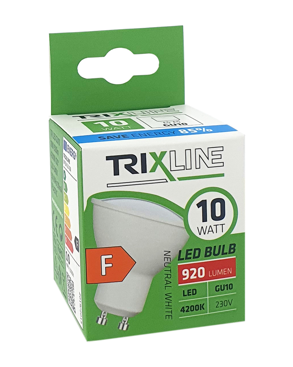 Úsporná LED žárovka Trixline s paticí GU10, šetrná k životnímu prostředí, neobsahuje žádnou rtuť ani olovo, navíc se dobře osvědčuje i při extrémně nízkých i vysokých teplotách, kdy s vláknovými žárovkami bývají problémy. Její životnost dosahuje až 30 000 hodin. Díky svému výkonu 10W výborně poslouží jako náhrada za klasickou 70W žárovku. LED žárovka se po zapnutí okamžitě rozsvítí bez jakékoliv prodlevy a vyzařuje příjemné neutrální bílé světlo 4200K.