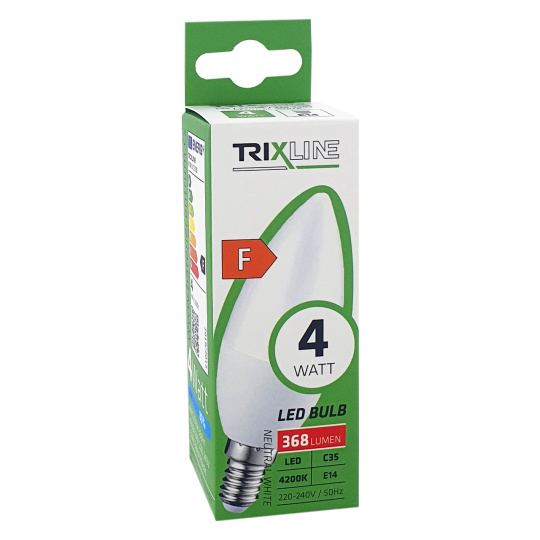 LED úsporná žárovka TRIXLINE (ušetříte 85% energie) s paticí E14, šetrná k životnému prostředí, neobsahuje žádnou rtuť ani olovo, navíc se dobře osvědčuje i při extrémně nízkých i vysokých teplotách, kdy s vláknovými žárovkami bývají problémy. Její životnost dosahuje až 30 000 hodin. Díky svému výkonu 4W výborně poslouží jako náhrada za klasickou 37W žárovku. LED žárovka se po zapnutí okamžitě rozsvítí bez jakékoliv prodlevy a vyzařuje příjemné neutrální bílé světlo 4200K.