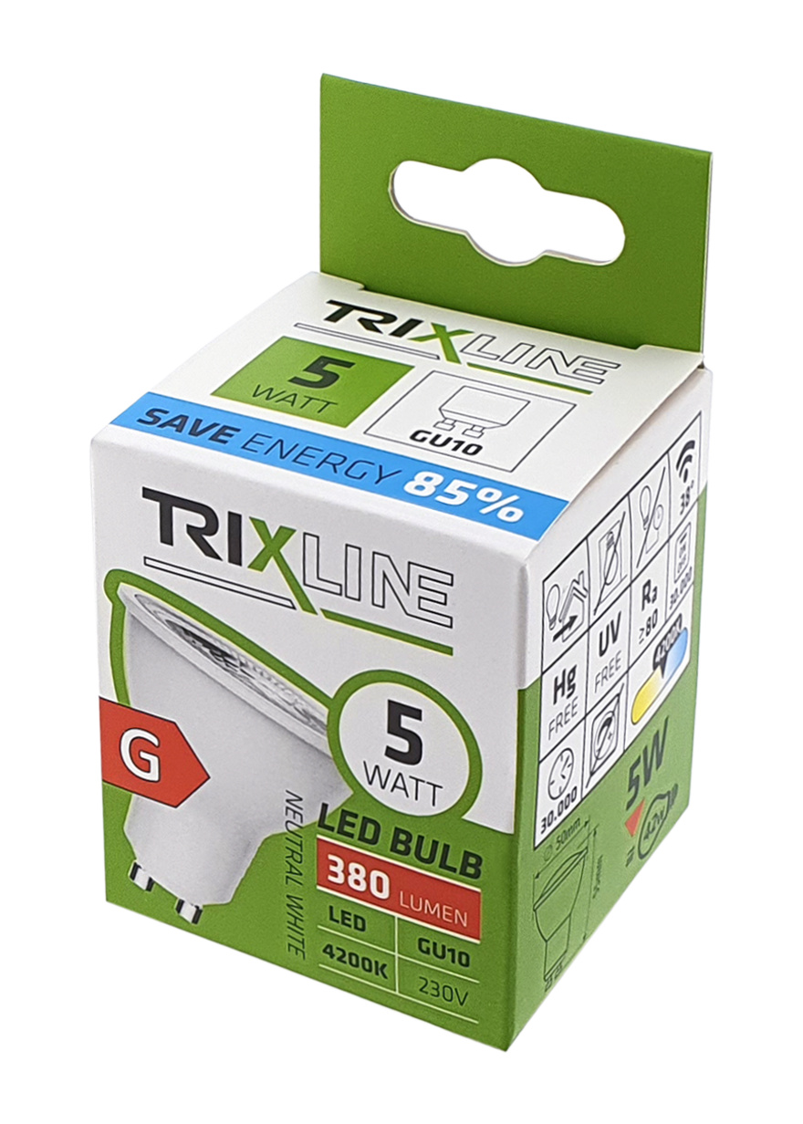 LED BODOVÁ ŽÁROVKA TRIXLINE je úsporná LED žárovka s paticí GU10, šetrná k životnímu prostředí, neobsahuje totiž žádnou rtuť ani olovo, navíc se dobře osvědčuje i při extrémně nízkých i vysokých teplotách, kdy s vláknovými žárovkami bývají problémy. Její životnost dosahuje až 30 000 hodin. Díky svému výkonu 5W výborně poslouží jako náhrada za klasickou 42W žárovku. LED žárovka se po zapnutí okamžitě rozsvítí bez jakékoliv prodlevy a vyzařuje příjemné neutrální bílé světlo 4200K.