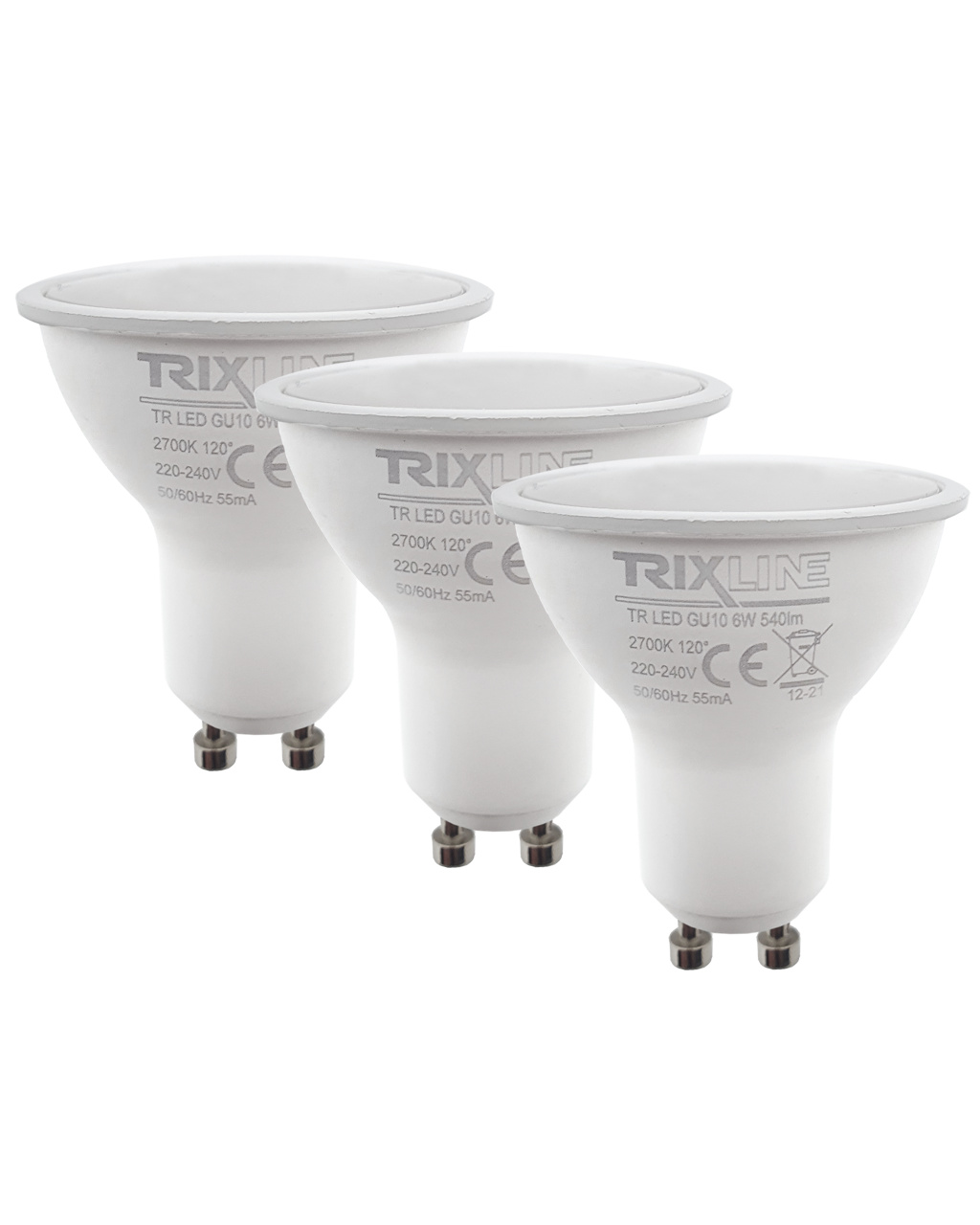 BODOVÉ LED ŽÁROVKY TRIXLINE ve výhodném balení po 3 kusech. Úsporná LED žárovka s paticí GU10 je šetrná k životnímu prostředí, neobsahuje žádnou rtuť ani olovo. Na rozdíl od vláknových žárovek se osvědčuje i při extrémně nízkých a vysokých teplotách. Její životnost dosahuje až 30 000 hodin. Díky svému výkonu 6W výborně poslouží jako náhrada za klasickou 50W žárovku. LED žárovka se po zapnutí okamžitě rozsvítí bez jakékoliv prodlevy a vyzařuje příjemné teplé bílé světlo 2700K. Žárovku můžete použít v ložnici, obývacím pokoji apod.
