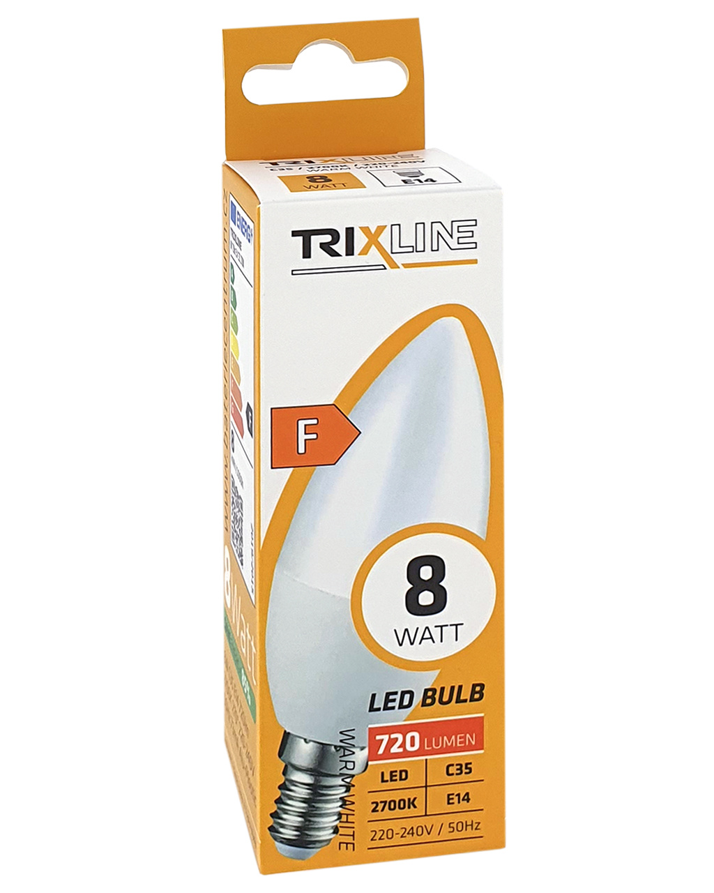 LED úsporná žárovka TRIXLINE (ušetříte 85% energie) s paticí E14, šetrná k životnému prostředí, neobsahuje žádnou rtuť ani olovo, navíc se dobře osvědčuje i při extrémně nízkých i vysokých teplotách, kdy s vláknovými žárovkami bývají problémy. Její životnost dosahuje až 30 000 hodin. Díky svému výkonu 8W výborně poslouží jako náhrada za klasickou 70W žárovku. LED žárovka se po zapnutí okamžitě rozsvítí bez jakékoliv prodlevy a vyzařuje příjemné teplé bílé světlo 2700K.