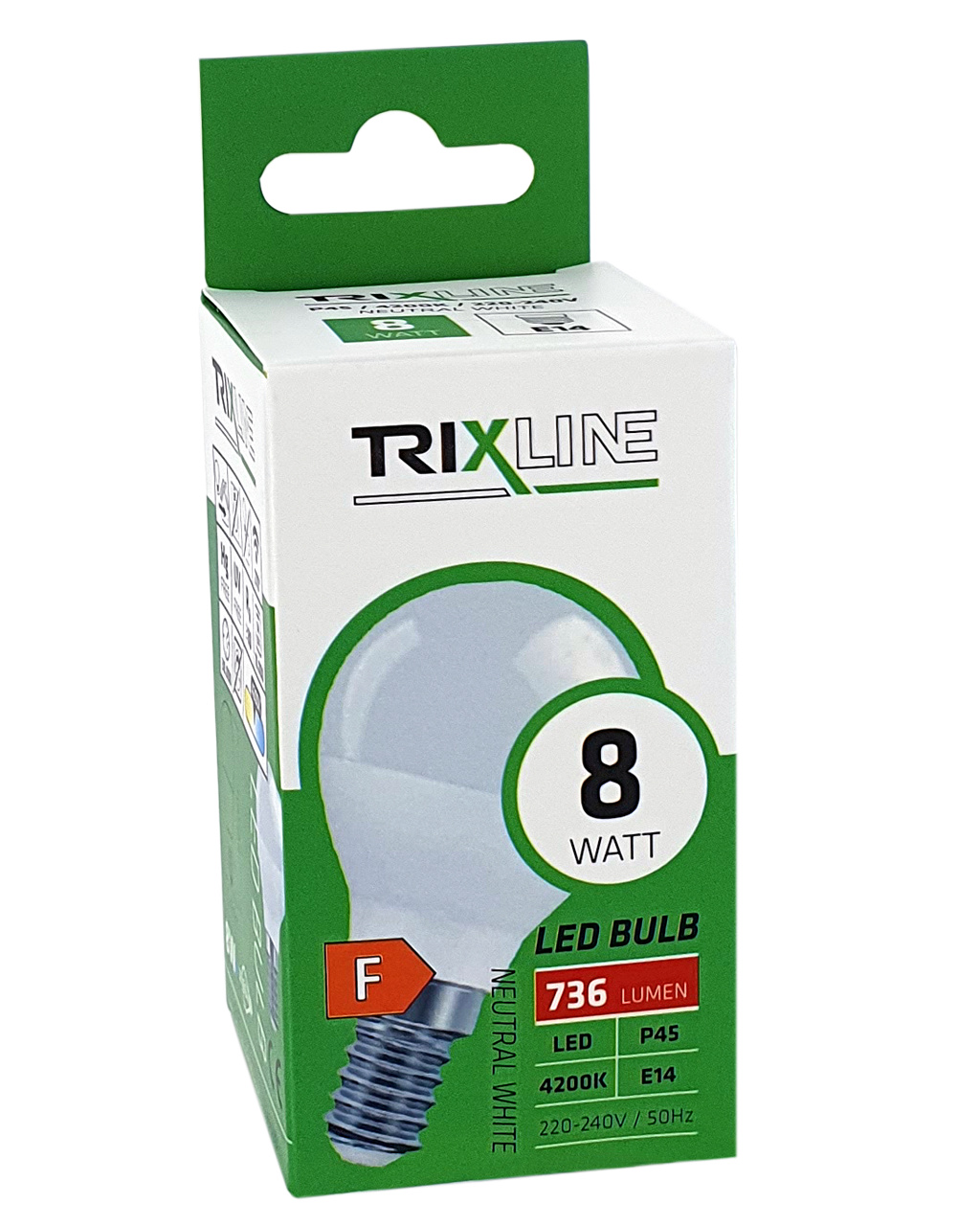 LED úsporná žárovka TRIXLINE (ušetříte 85% energie) s paticí E14, šetrná k životnému prostředí, neobsahuje žádnou rtuť ani olovo, navíc se dobře osvědčuje i při extrémně nízkých i vysokých teplotách, kdy s vláknovými žárovkami bývají problémy. Její životnost dosahuje až 30 000 hodin. Díky svému výkonu 8W výborně poslouží jako náhrada za klasickou 60W žárovku. LED žárovka se po zapnutí okamžitě rozsvítí bez jakékoliv prodlevy a vyzařuje příjemné neutrální bílé světlo 4200K.
