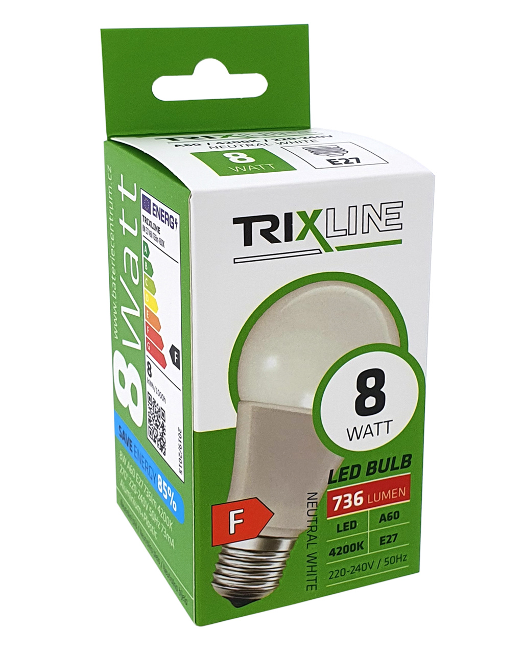 LED ŽÁROVKA TRIXLINE je úsporná LED žárovka s paticí E27, šetrná k životnému prostředí, neobsahuje totiž žádnou rtuť ani olovo, navíc se dobře osvědčuje i při extrémně nízkých i vysokých teplotách, kdy s vláknovými žárovkami bývají problémy. Její životnost dosahuje až 30 000 hodin. Díky svému výkonu 8W výborně poslouží jako náhrada za klasickou 73W žárovku. LED žárovka se po zapnutí okamžitě rozsvítí bez jakékoliv prodlevy a vyzařuje příjemné studené bílé světlo 4200K.