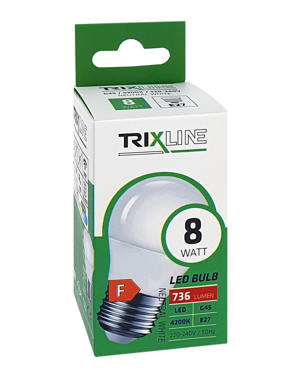 LED úsporná žárovka TRIXLINE (ušetříte 85% energie) s paticí E27, šetrná k životnému prostředí, neobsahuje žádnou rtuť ani olovo, navíc se dobře osvědčuje i při extrémně nízkých i vysokých teplotách, kdy s vláknovými žárovkami bývají problémy. Její životnost dosahuje až 30 000 hodin. Díky svému výkonu 8W výborně poslouží jako náhrada za klasickou 60W žárovku. LED žárovka se po zapnutí okamžitě rozsvítí bez jakékoliv prodlevy a vyzařuje příjemné neutrální bílé světlo 4200K.