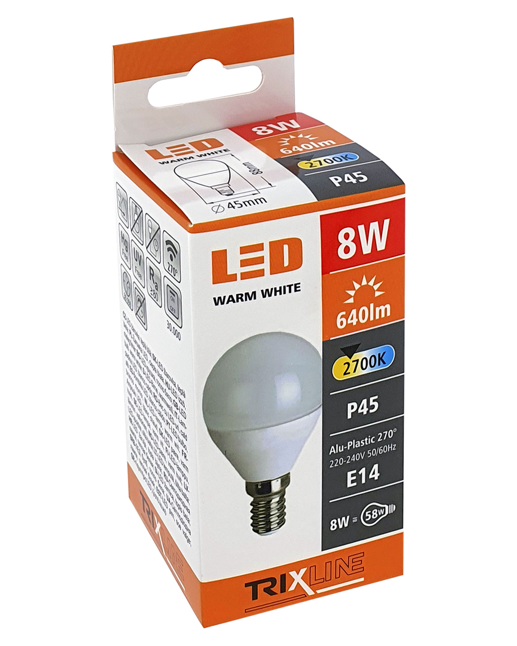 LED ŽÁROVKA TRIXLINE je úsporná LED žárovka s paticí E14, šetrná k životnímu prostředí, neobsahuje totiž žádnou rtuť ani olovo, navíc se dobře osvědčuje i při extrémně nízkých i vysokých teplotách, kdy s vláknovými žárovkami bývají problémy. Její životnost dosahuje až 30 000 hodin. Díky svému výkonu 8W výborně poslouží jako náhrada za klasickou 58W žárovku. LED žárovka se po zapnutí okamžitě rozsvítí bez jakékoliv prodlevy a vyzařuje příjemné teplé bílé světlo 2700K.