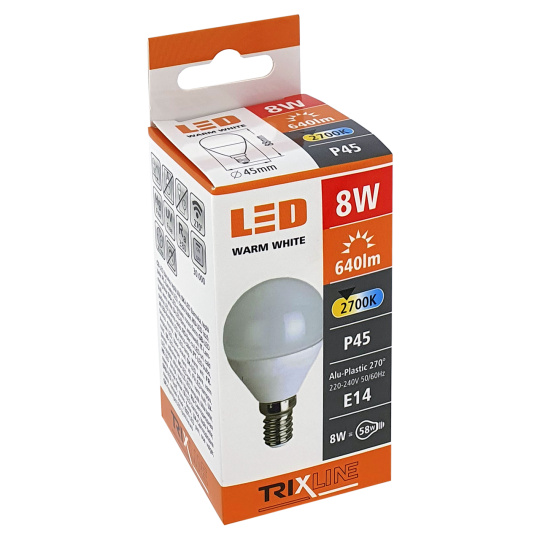 LED žárovka Trixline 8W E14 P45 teplá bílá