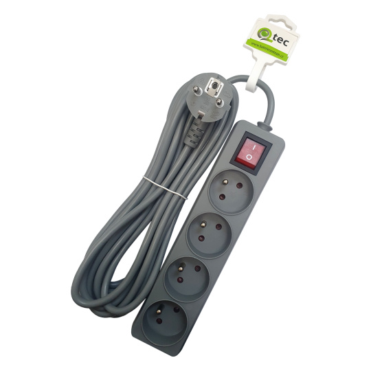 Prodlužovací přívod šedý 4 zásuvky s vypínačem, 5m, Q-404F QTEC