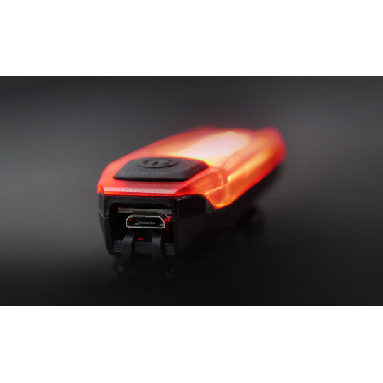 Velkokapacitní baterie - Svítilna je napájena 300mAh Li-ion nabíjecí baterií s dlouhou životností. Výdrž baterie při plném nabití závisí na zvoleném módu, při aktivním používání zajišťuje až 2-5 hodin svícení. Interní akumulátor jednoduše nabijete pomocí přiloženého micro-USB konektoru. Svítilna obsahuje LED diody označující stupeň nabití. Nabíjení signalizuje oranžové světlo, po nabití se rozsvítí zelená dioda.