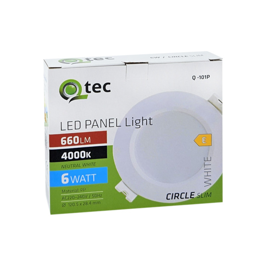 Kruhový vestavný LED panel Qtec Q-101P o výkonu 6W se světelným tokem 660lm a neutrální bílou barvou světla 4000K. Panel je vyroben z plastu. Díky použité LED technologii ušetříte až 85% energie. Je určen do interiéru k zapuštění do sádrokartónu s montážním otvorem o průměru ø9,2cm. Vnější rozměr světla je ø12x2,8cm. Rychlá a snadná instalace pomocí vodičů L a N (není potřeba trafo).