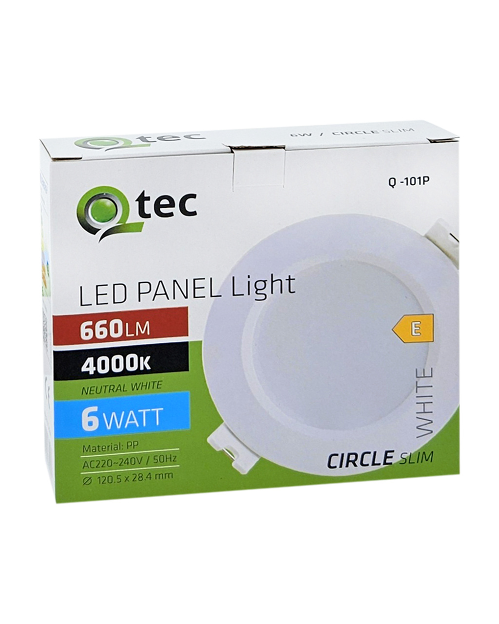 Kruhový vestavný LED panel Qtec Q-101P o výkonu 6W se světelným tokem 660lm a neutrální bílou barvou světla 4000K. Panel je vyroben z plastu. Díky použité LED technologii ušetříte až 85% energie. Je určen do interiéru k zapuštění do sádrokartónu s montážním otvorem o průměru ø9,2cm. Vnější rozměr světla je ø12x2,8cm. Rychlá a snadná instalace pomocí vodičů L a N (není potřeba trafo).
