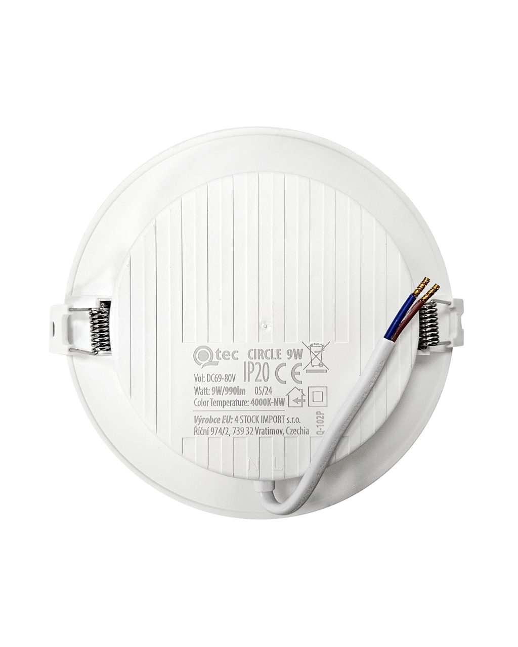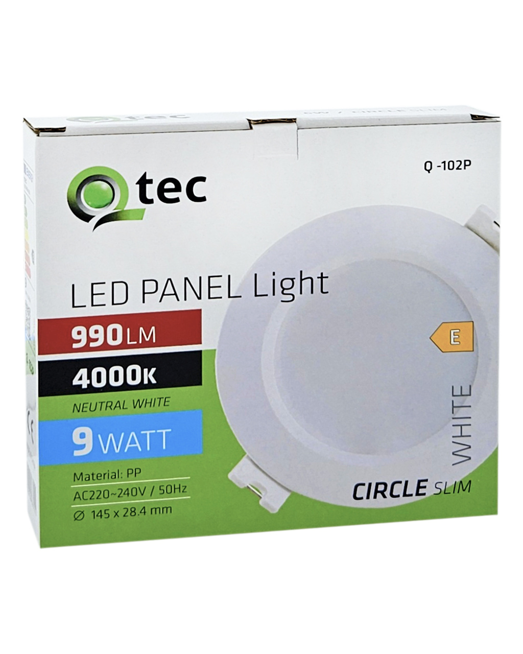 Kruhový vestavný LED panel Qtec Q-102P o výkonu 9W se světelným tokem 990lm a neutrální bílou barvou světla 4000K. Panel je vyroben z plastu. Díky použité LED technologii ušetříte až 85% energie. Je určen do interiéru k zapuštění do sádrokartónu s montážním otvorem o průměru 11cm. Vnější rozměr světla je ø14,5x2,84cm. Rychlá a snadná instalace pomocí vodičů L a N (není potřeba trafo).