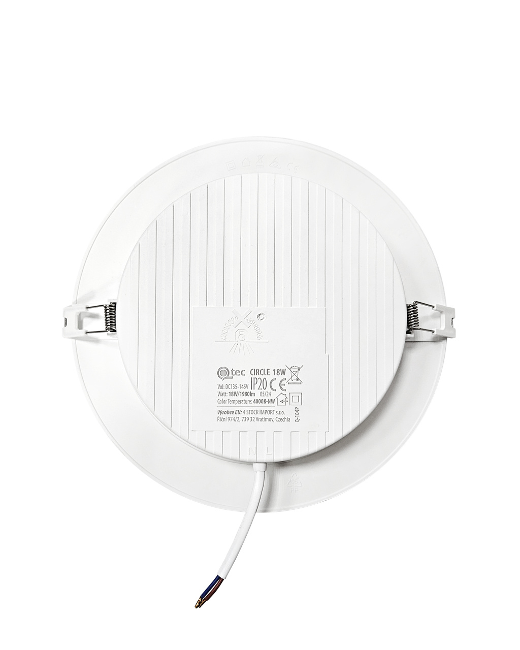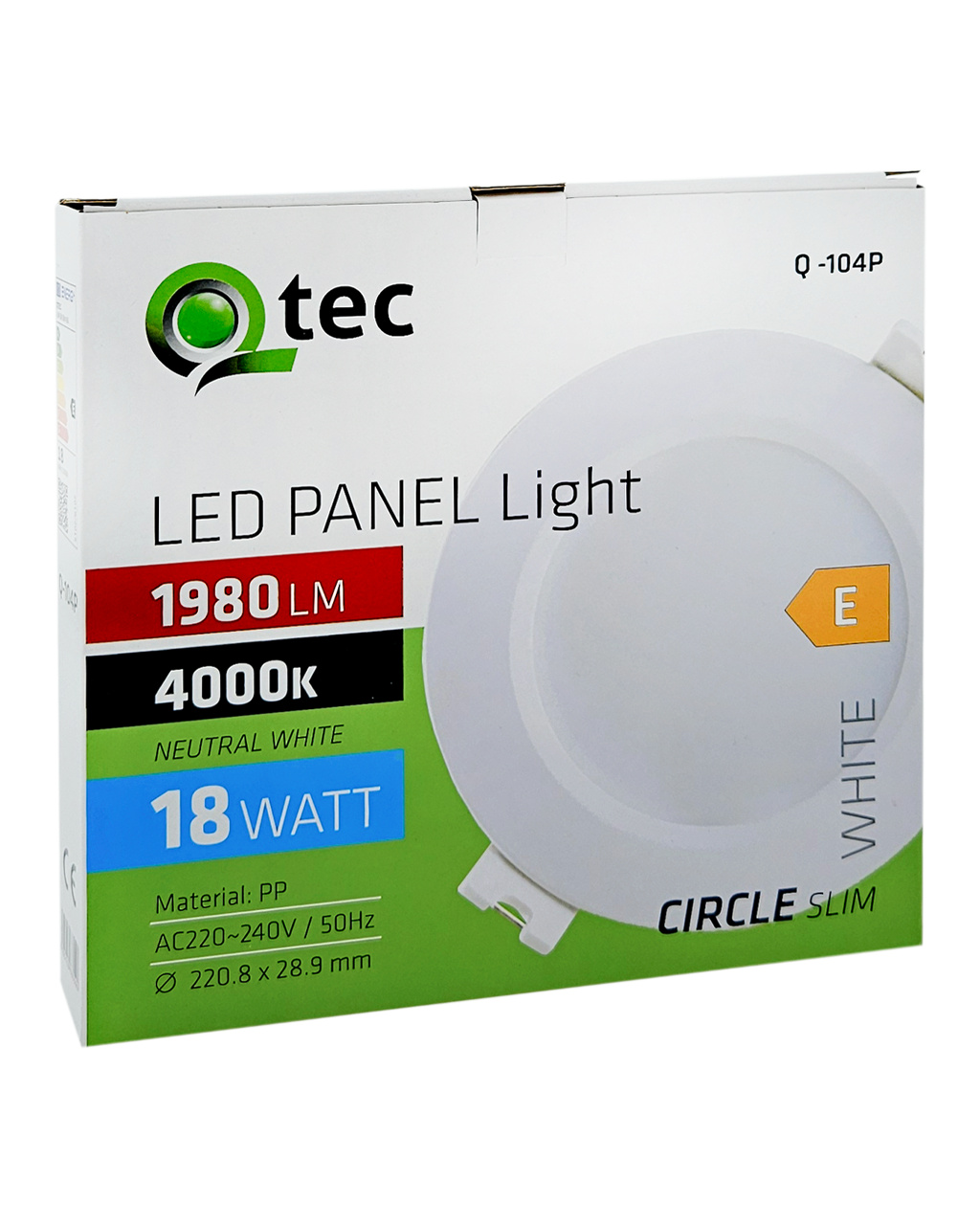 Kruhový vestavný LED panel Qtec Q-104P o výkonu 18W se světelným tokem 1980lm a neutrální bílou barvou světla 4000K. Díky použité LED technologii ušetříte až 85% energie. Je určen do interiéru k zapuštění do sádrokartónu s montážním otvorem o průměru 16,7cm. Vnější rozměr světla je ø22,08x2,89cm. Rychlá a snadná instalace pomocí vodičů L a N (není potřeba trafo).