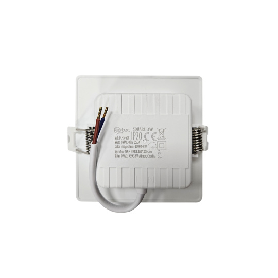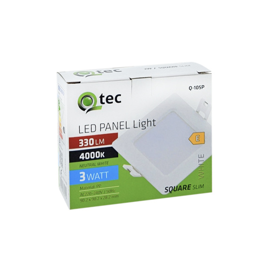 Čtvercový vestavný LED panel Qtec Q-105P o výkonu 3W se světelným tokem 330lm a neutrální bílou barvou světla 4000K. Panel je vyroben z plastu. Díky použité LED technologii ušetříte až 85% energie. Je určen do interiéru k zapuštění do sádrokartónu s montážním otvorem 6,8x6,8cm. Vnější rozměr světla je 9x9x2,82cm. Rychlá a snadná instalace pomocí vodičů L a N (nemá trafo).