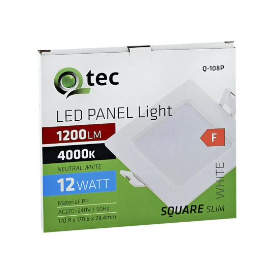 Čtvercový vestavný LED panel Qtec Q-108P o výkonu 12W se světelným tokem 1200lm a neutrální bílou barvou světla 4000K. Panel je vyroben z plastu. Díky použité LED technologii ušetříte až 85% energie. Je určen do interiéru k zapuštění do sádrokartónu s montážním otvorem 13x13cm. Vnější rozměr světla je 17,08x17,08x2,84cm. Rychlá a snadná instalace pomocí vodičů L a N (není potřeba trafo).