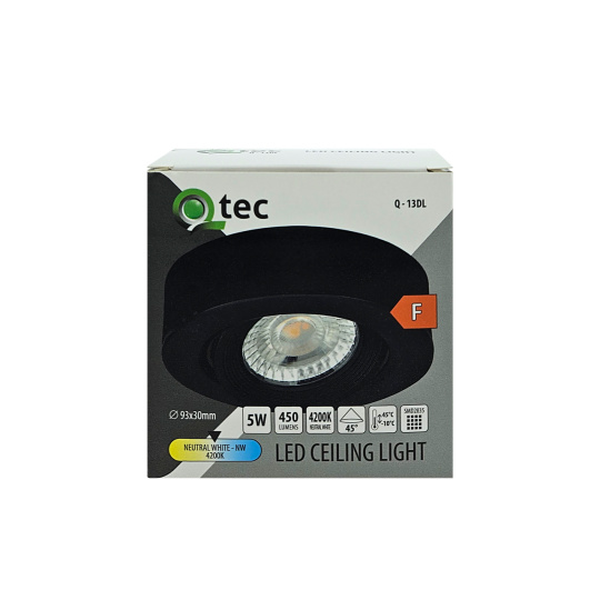 Q-13DL LED stropní 5W bodové světlo 2v1 Qtec je navrženo tak, aby mohlo být připevněno buď vestavně do sádrokartónu (součástí balení jsou montážní pružinky) nebo jako přisazené světlo na povrch stropu. Elegantní černé provedení doplní moderní interiéry. Navíc lze světlo naklápět do stran. Rychlá a snadná instalace pomocí vodičů L a N. Svítidlo je vyrobeno z kvalitního polyamidu, který se vyznačuje vysokou odolností, pevností a flexibilitou.