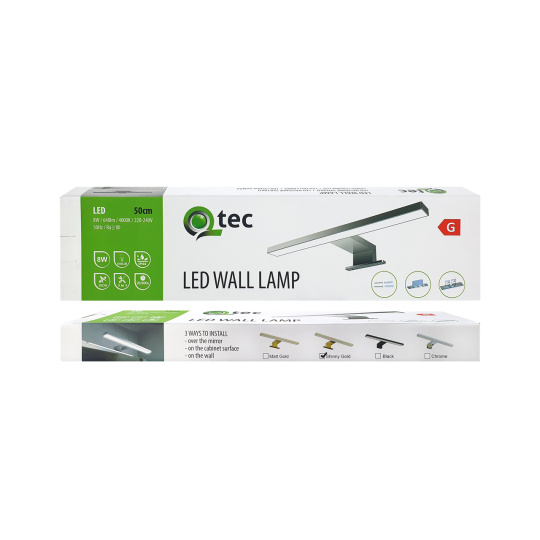 Předností koupelnového nástěnného osvětlení Q-305G Qtec 8W je moderní design, kvalitní zpracování, stupeň krytí IP44 umožňuje instalovat světlo do místnosti se zvýšenou vlhkostí např. koupelny, 3v1 způsoby montáže na zrcadlo, skříňku nebo stěnu. Zdrojem světla jsou energeticky úsporné LED diody, které vyzařují neutrální bílou barvu světla 4000K příjemnou pro oči. Koupelnové osvětlení nabízíme ve 4 barevných variantách - matné zlaté - lesklé zlaté - černé - chrom.
